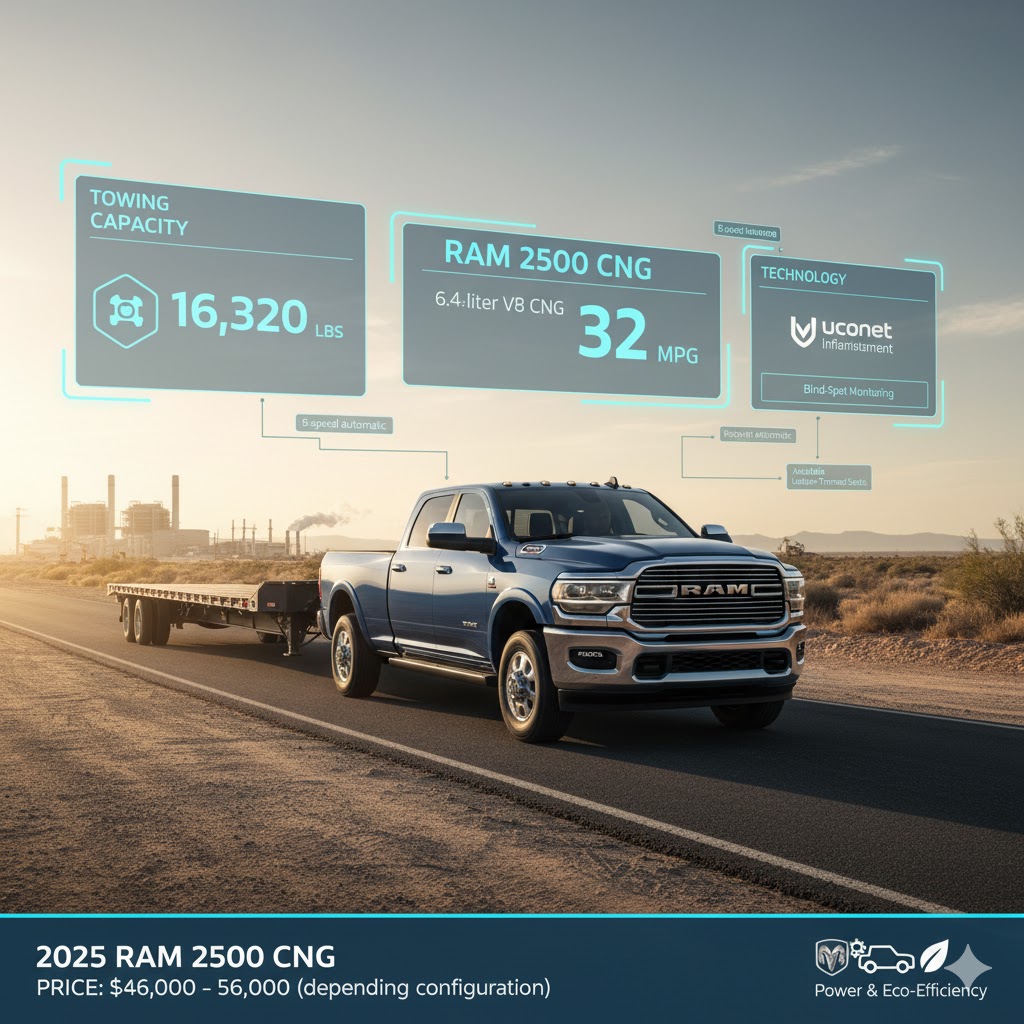 For those who demand serious performance, the Ram 2500 CNG delivers raw power and eco-efficiency in equal measure. Known for its toughness and towing capability, this truck is engineered to handle heavy loads while offering the benefits of a natural gas powered car.